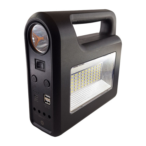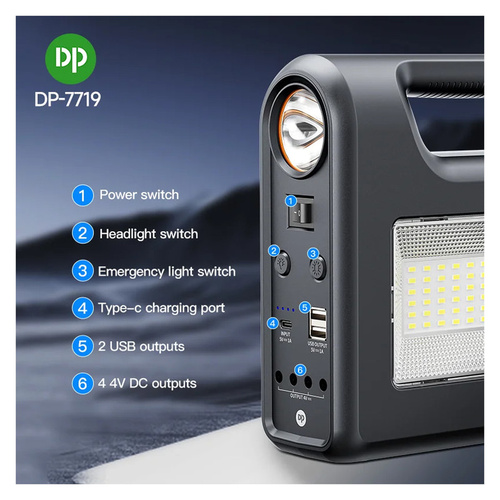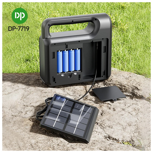 چراغ خورشیدی برند دی پی مدل 7719 با باتری لیتیومی 8000 میلی آمپر قابل تعویض را می توان از وسایل ضروری مسافرت و کمپینگ بشمار آورد. با صفحه سولاری که همراه محصول هست می توان از انرژی خورشیدی برای شارژ آن استفاده کرد. این پک همراه با 3 عدد چراغ سیار عرضه می گردد. 2 عدد خروجی پاوربانک روی این محصول تبیعه شده است. و علاوه بر صفحه ی خورشیدی با ورودی تایپ C نیز می توان این محصول را شارژ کرد. در مکان هایی که دسترسی به برق وجود ندارد، این محصول نیاز روشنایی شما را برآورده می سازد.